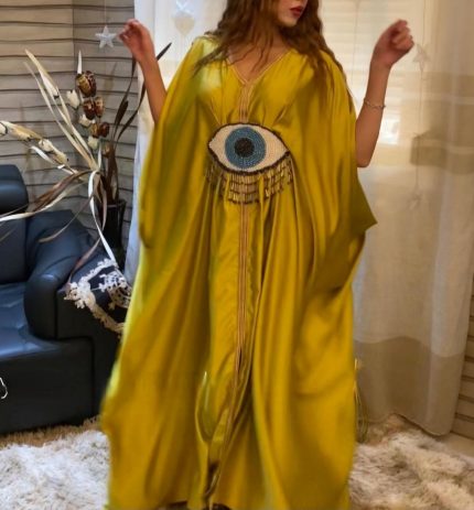 Stunning Kaftan Rhinestone Embroidered Loose Dress. This loose-fitting kaftan dress is made from high-quality satin fabric, providing both style and comfort.